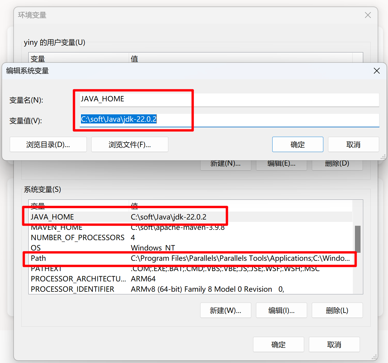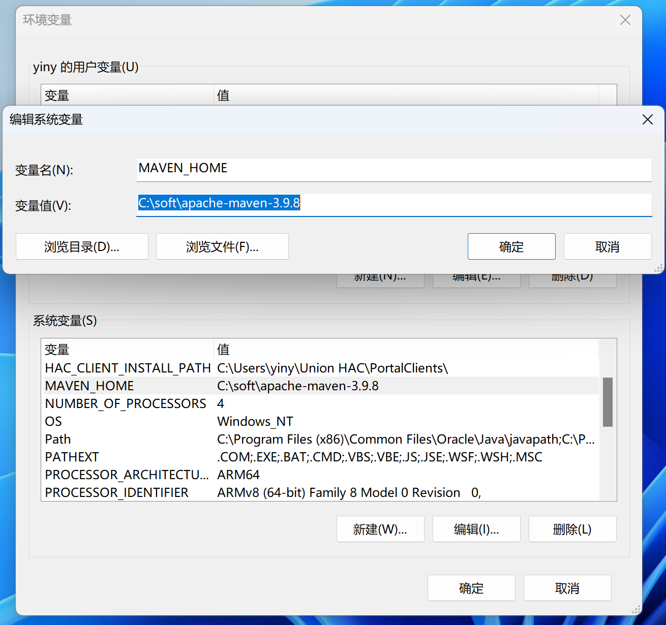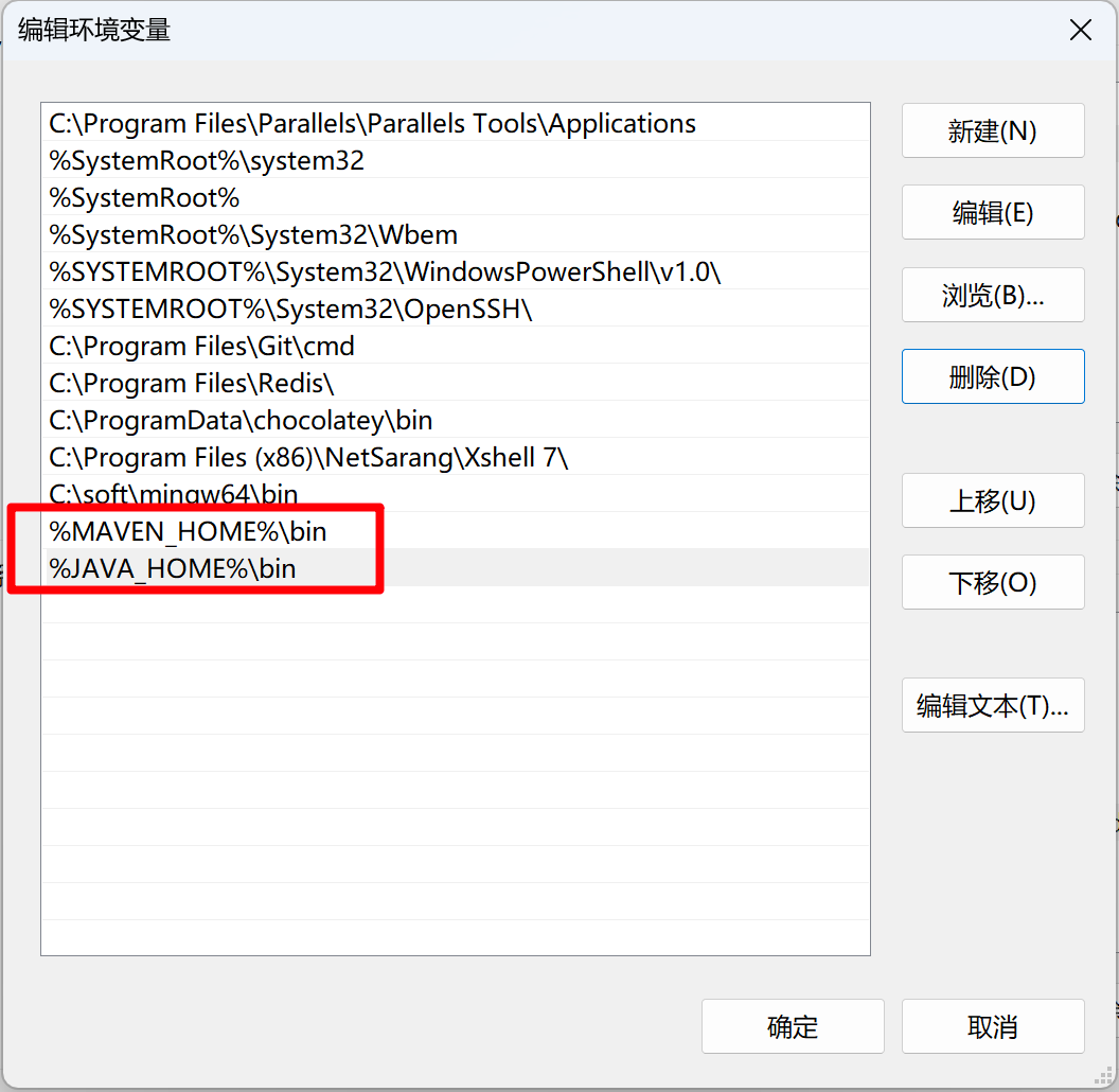 MAVEN_HOME的值为Maven的安装路径,PATH中添加%MAVEN_HOME%\bin,如下图所示: